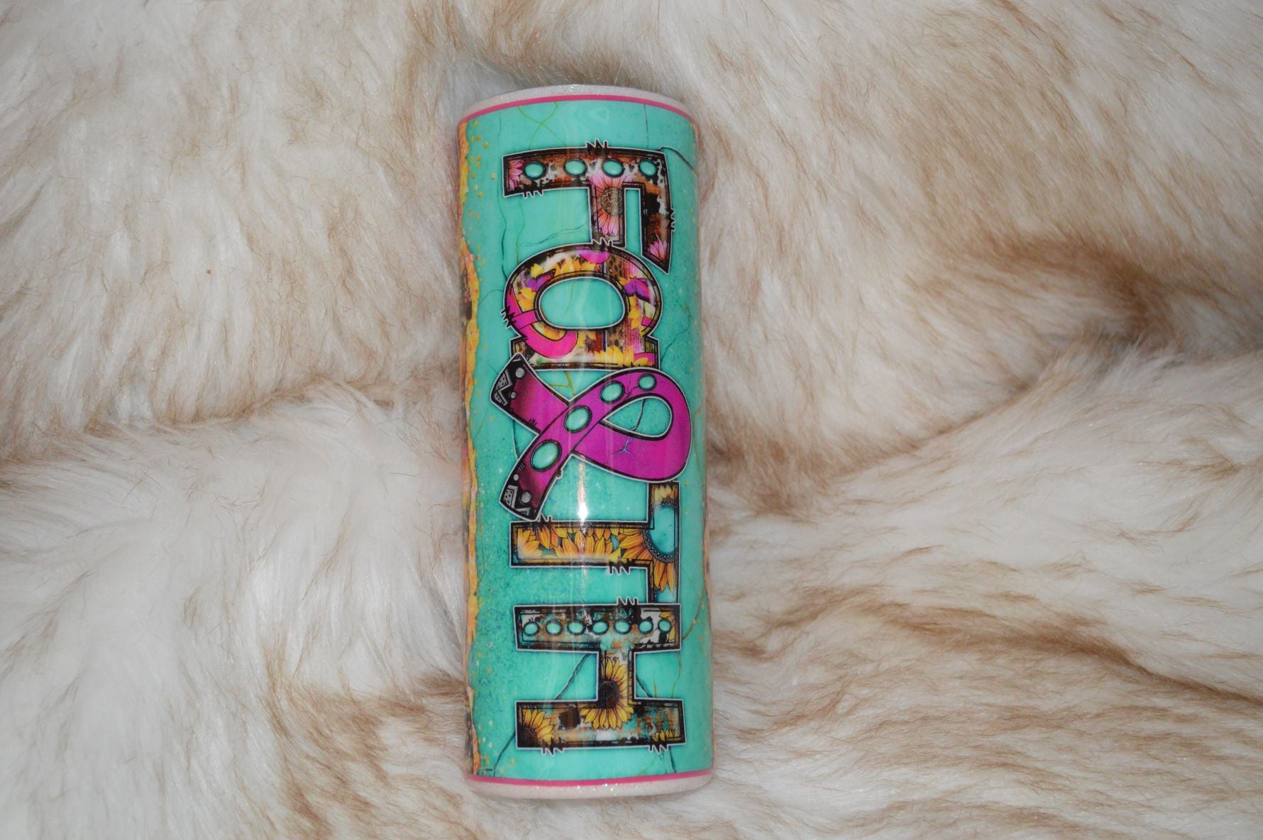 20oz. Stainless steel tumbler with vinyl wrap that has an epoxy overlay, Breast Cancer Awareness with Faith. Tumbler comes with sliding lid and straw.