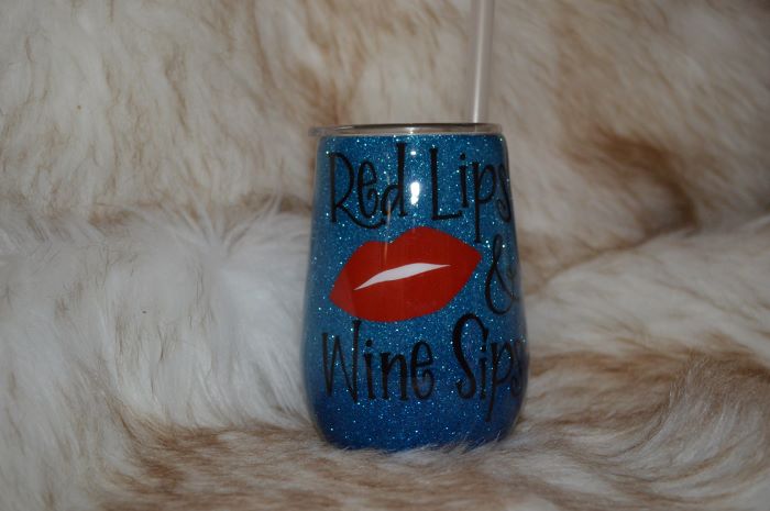 Stainless Steel Stemless Glittered Wine Tumbler "Red Lips & Wine Sips" Tumbler Comes With Lid and Straw