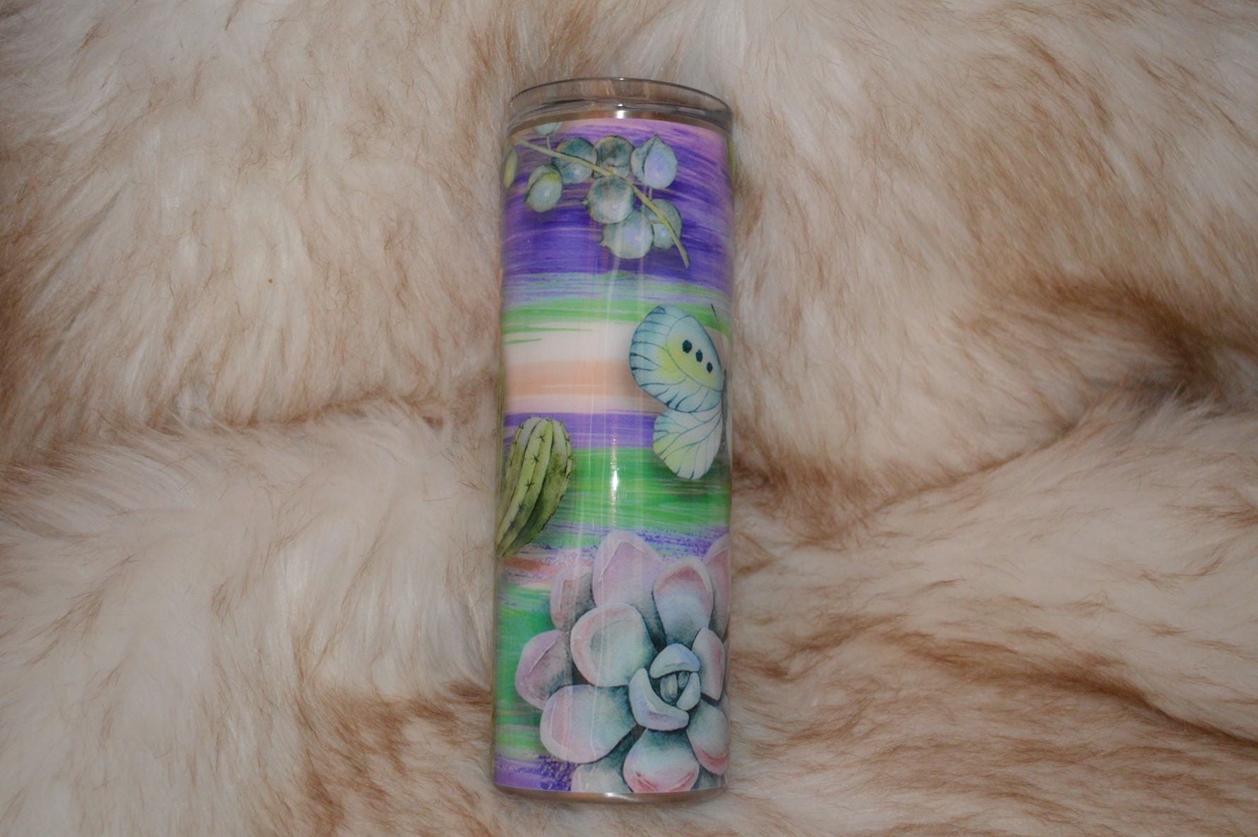 20oz Stainless steel tumbler with vinyl wrap in Succulents design with an epoxy overlay. Tumbler comes with sliding lid and straw.